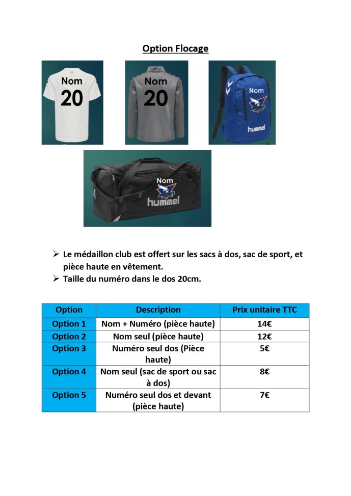 Tarification flocage pièce haute, sac de sport et sac à dos | Boutique Bihorel Handball